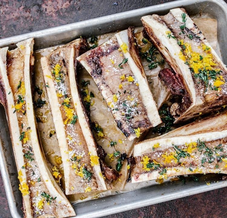 Говежди тръбни кости подходящи за фурна или бульон. Нарязани на парчета, разполовени през средата. Костният мозък от пасищни животни е деликатес с богато съдържание на колаген и невероятно маслено-кремообразна текстура. Изпечен е идеален за намазване върху филийка хляб или върху повърхността на прясно приготвен стек.